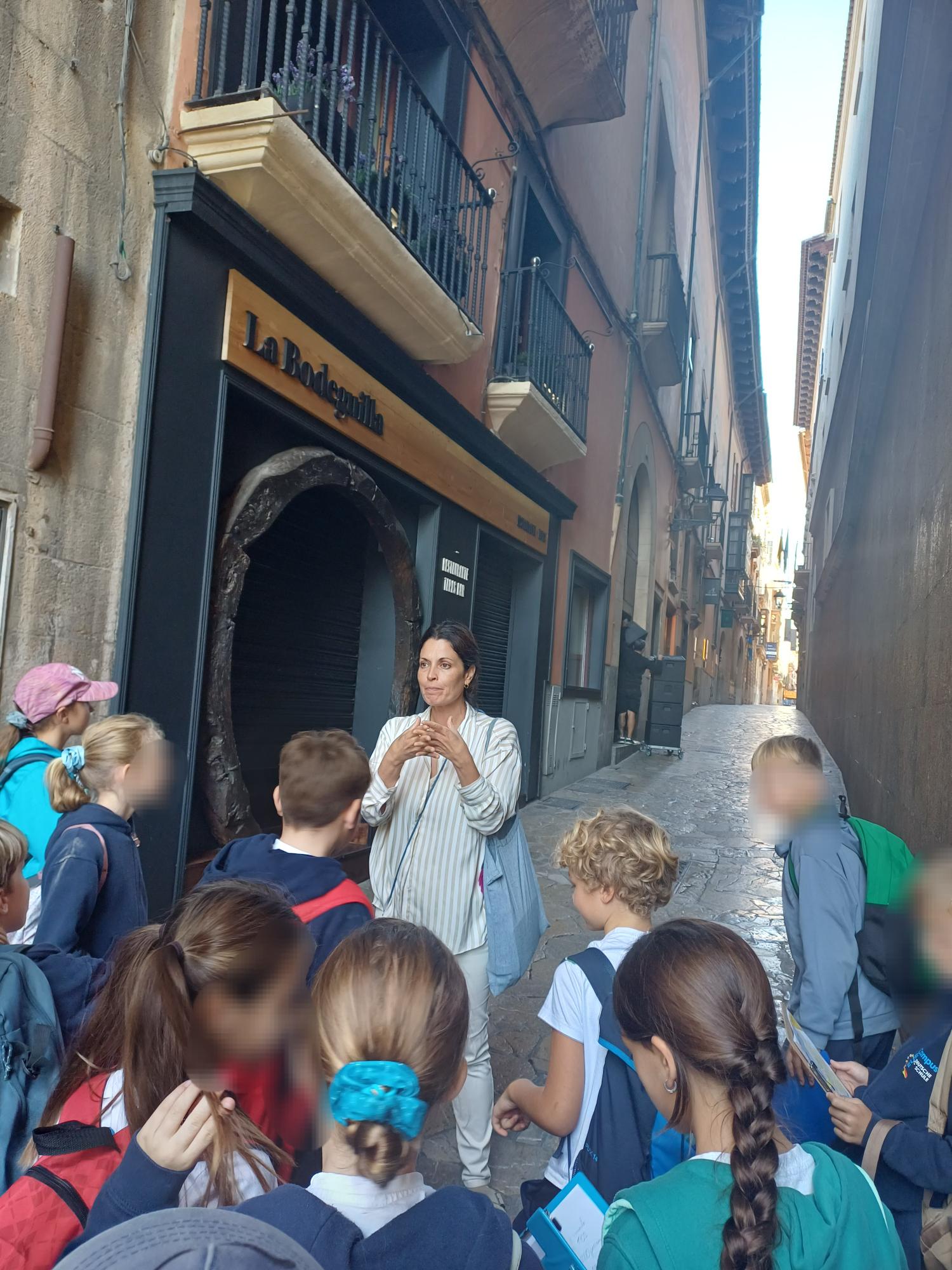 Die Kinder erfuhren viele interessante Dinge, zum Beispiel, wer Santa Catalina Tomás war und wo man die engste Gasse der Stadt findet. Besonders spannend war die Entdeckung, dass früher dort, wo heute der Passeig del Born verläuft, einmal ein Fluss war! Und dort sogar ein Anker gefunden worden ist – ein Hinweis darauf, dass das Meer und die Schiffe damals bis hierher kamen. ⚓